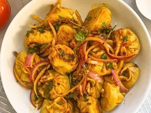 Momo mixed with green pepper, coriander, onion and tossed with nepalese spices